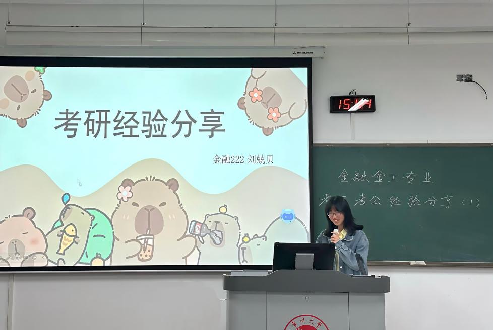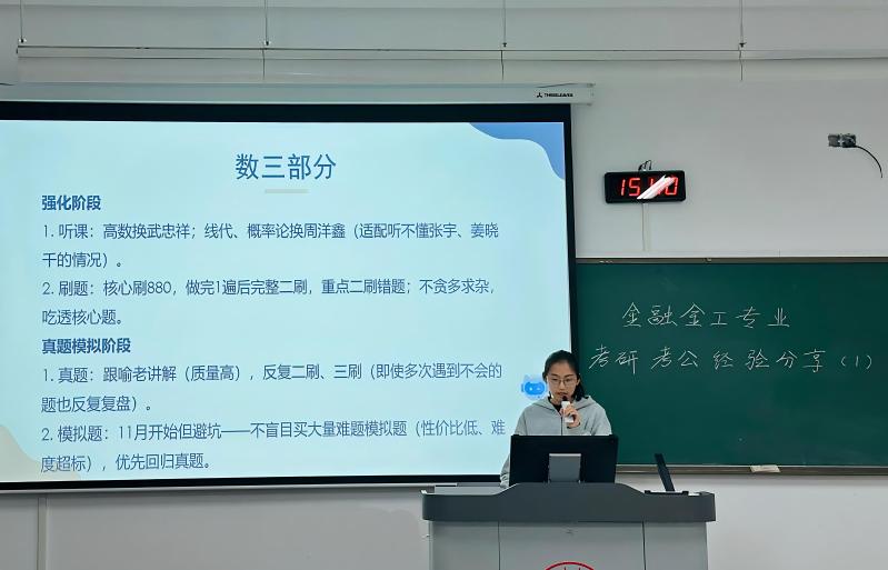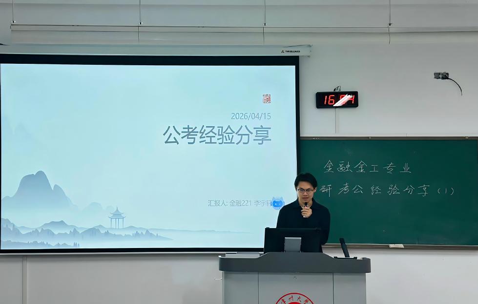 为帮助2023级学子明晰备考方向、科学规划发展路径,4月15日下午,色情网 于西太湖校区立德楼117教室开展了金融系考研考公经验分享会。本次分享会特邀姜旭老师以及三位“成功上岸”的2026届优秀学子作为主讲人,聚焦备考过程中的核心困惑与实战策略,为同学们带来了一场干货满满的经验盛宴。