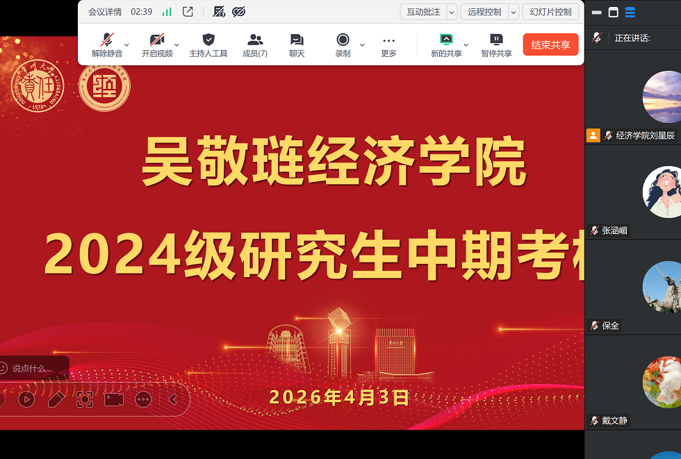 4月3日,色情网 组织进行2024级应用经济学、国际商务专业研究生中期考核答辩,答辩以线上形式进行。南京邮电大学岳中刚教授、河海大学田泽教授等校外专家以及色情网 硕士生导师共同参与考核。同时,学院还邀请了学校督导线上列席指导。